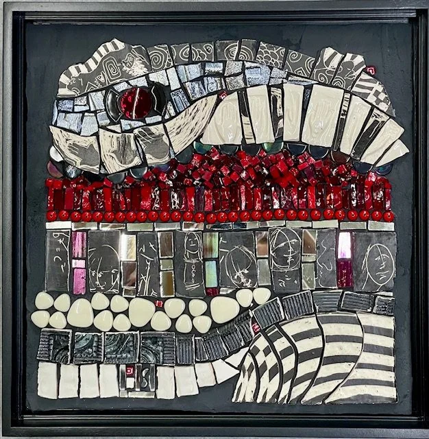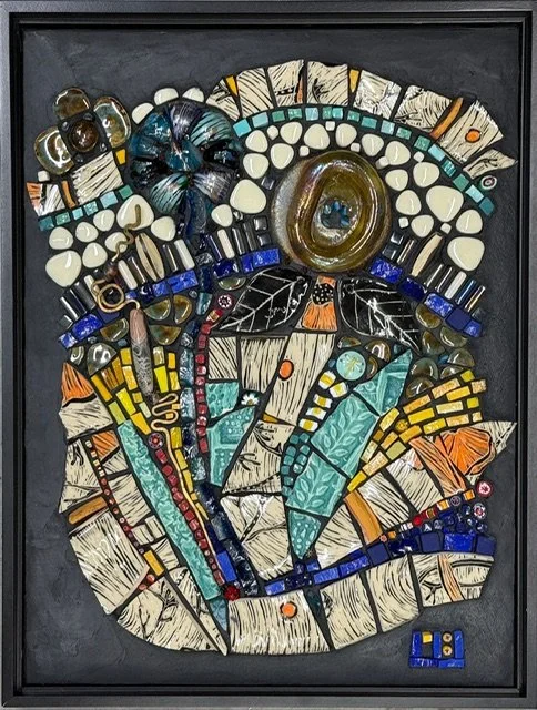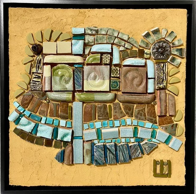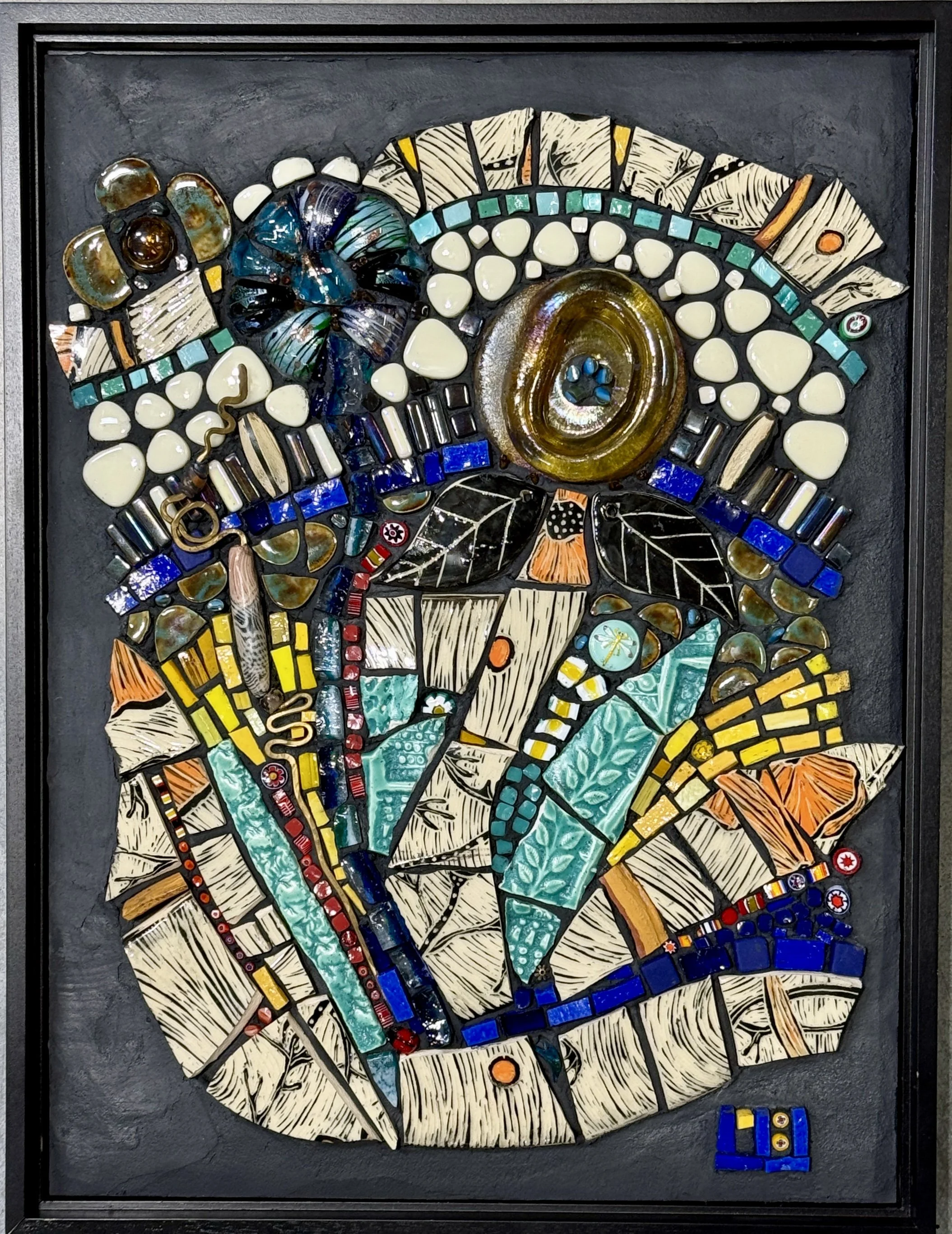 My modern abstract mosaics draw inspiration from a variety of materials, textures and color combinations. I breathe new life into broken vessels, discarded tiles, and vintage jewelry, incorporating their fragments alongside pieces of handmade pottery. Natural elements like rocks and gemstones harmonize with the manufactured precision of beads and buttons. The vibrant hues of Italian smalti add depth and brilliance to my work.